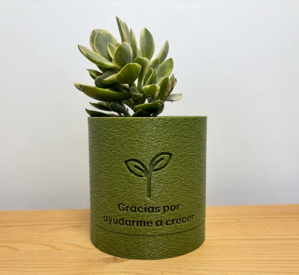 "Gracias por ayudarme a crecer." Un regalo con raíces. La maceta incluye drenaje y plato con cierre formando una única pieza. Diseñada y fabricada en Canarias con PLA reciclado.